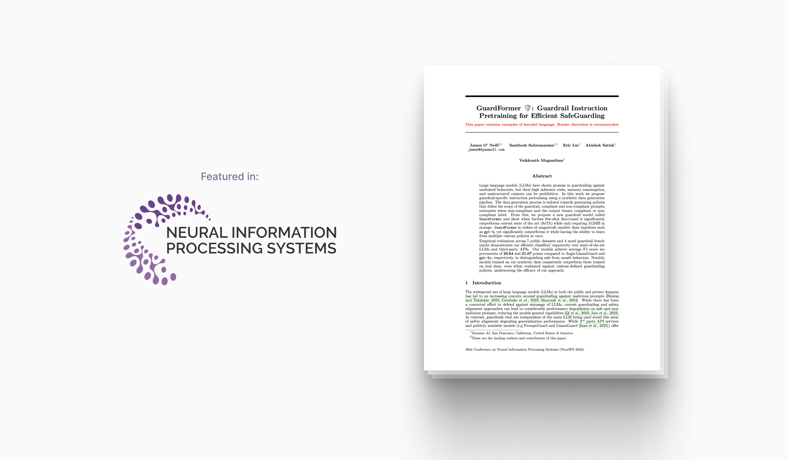 Empirical evaluation across 7 public datasets and 4 novel guardrail benchmarks demonstrates our efficient classifiers’ superiority over state-of-the-artLLMs and third-party APIs. Our models achieve average F1 score improvements of 29.64 and 21.07 points compared to Aegis-LlamaGuard and gpt-4o, respectively, in distinguishing safe from unsafe behaviors. Notably, models trained on our synthetic data consistently outperform those trained on real data, even when evaluated against custom-defined guardrailing policies, underscoring the efficacy of our approach.
